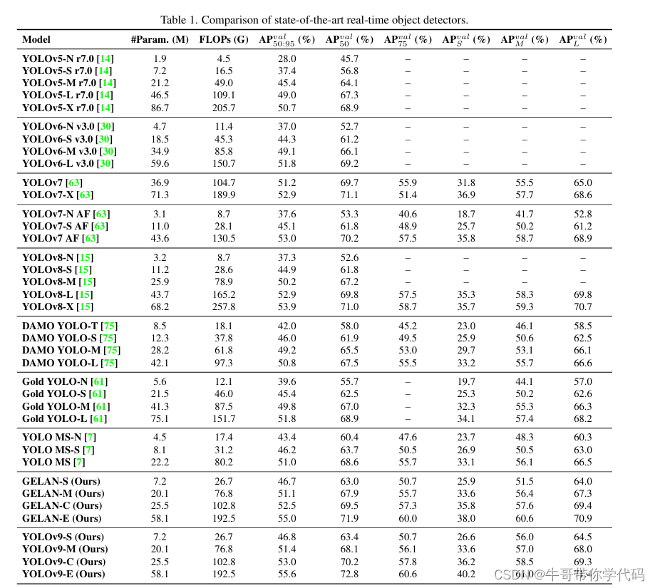 通过结合PGI和GELAN,开发了YOLOv9对象检测模型。该模型在保持轻量级和高效性的同时,显著提升了对象检测任务的准确性mAP等指标,超越了当前最先进的方法,如YOLOv5、YOLOv6、YOLOv7和YOLOv8等。(在此个人认为能确保轻量化的同时实现检测准确率的提升属实不容易)