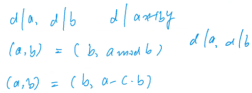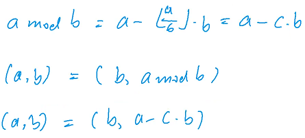 d 能整除 a - c × b,所以 d 能整除 a - c × b × 1 + b × c,抵消后 d 能整除 a,所以右边任何一个公约数都是左边的一个公约数