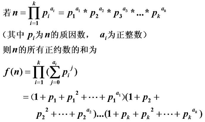 约数之和:(p1^0 + p1^1 + . . . + p1^α1) * . . . * (pk^0 + pk^1 + . . . + pk^αk)