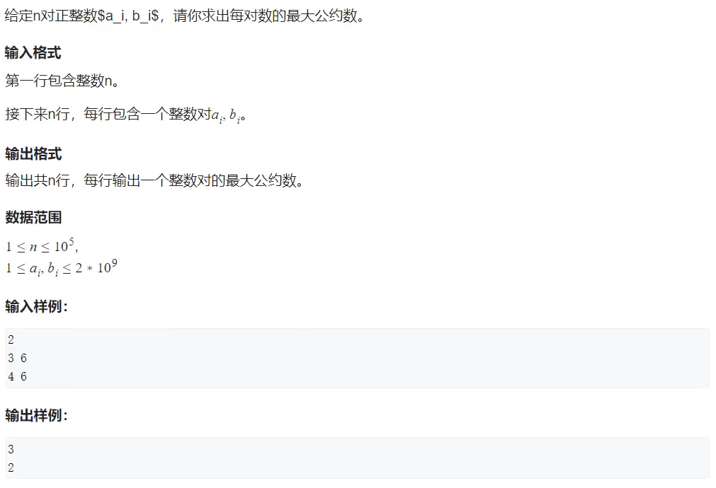 给出 n 组 a、b,求每一组的最大公约数,时间复杂度 O( logn )