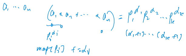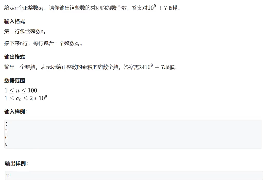 给定 n 个整数 a1 ~ an,要求统计所有数乘积 a1 × a2 × . . . × an 的约数个数,先求 a1 ~ an 每一个数分解质因数的结果,然后把每一个数的指数累加在一起就可以了,从 a1 开始分解,一直分解到 an,假设求出来 a1 的某一个质因子 pi 的指数是 αi,可以用一个哈希表或者 map 把它存储下来,把每一项都分解完之后,map 中存储了整个乘积的因式分解的底数和指数,最终约数个数就是所有指数加 1 再相乘