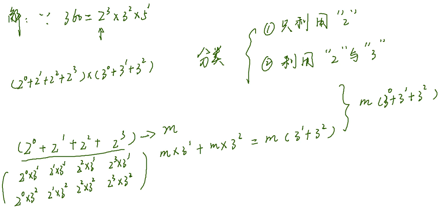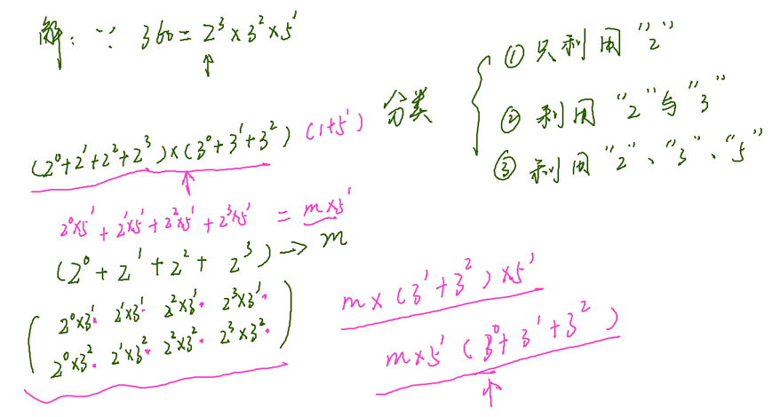 接下来求所有正约数之和,首先如果要把 360 的正约数全部穷举出来就是一个不小的工程,还需要求和,工程较大,容易出错,因此我们还是用造的思想把约数给造出来