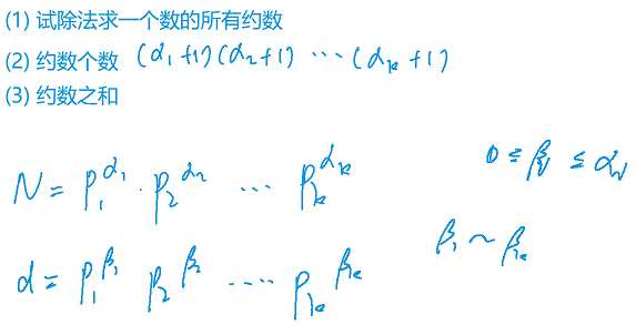 约数个数:(α1 + 1) * (α2 + 1) * . . . * (αk + 1),N 的约数个数和选法个数是一样的,乘法原理