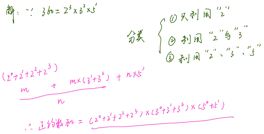 得到最终所有正约数的总和就是 ( 2^0 + 2^1 + 2^2 + 2^3) × (3^0 + 3^1 + 3^2) × (1 + 5^1)
