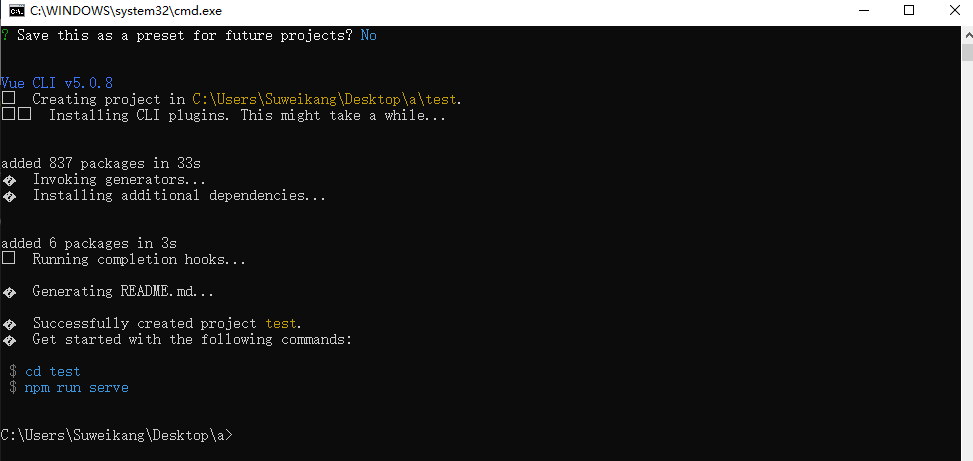 (1)以管理员身份打开命令行界面,进入任意一个想要创建项目的文件夹,输入