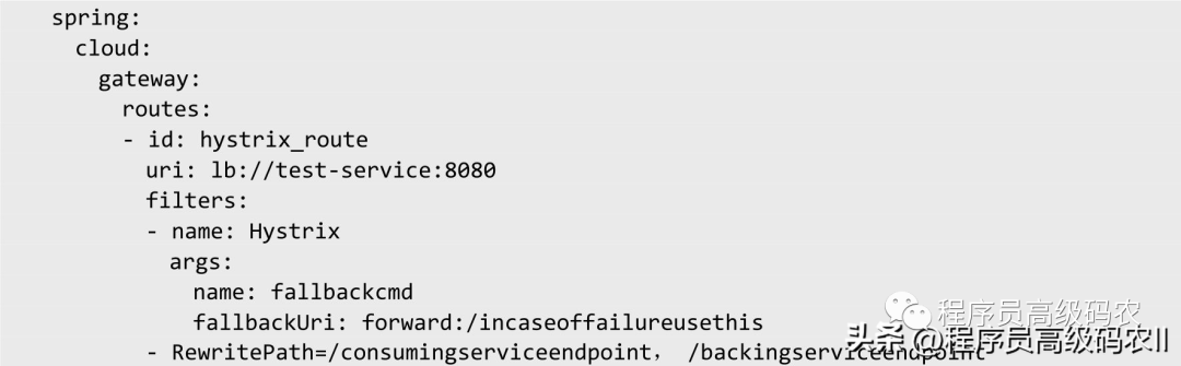 当调用hystrixfallback时,将转发到/incaseoffailureusethis。注意,这个示例还演示了通过目标URI上的“lb”前缀使Spring Cloud Netflix Ribbon客户端实现负载均衡。主要场景是网关应用程序中的内部控制器或处理程序使用fallbackUri,它也可以将请求重新路由到外部应用程序中的控制器或处理程序。