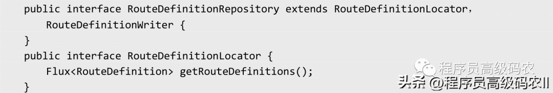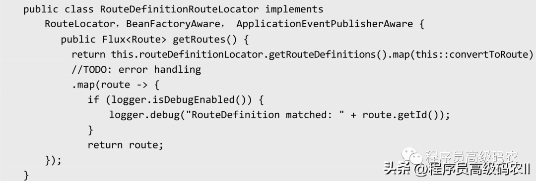 然后,跟进 getRouteDefinitions 方法,它是RouteDefinitionRouteLocator的回调方法,可以实时更新路由信息,代码如下: