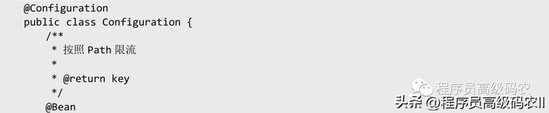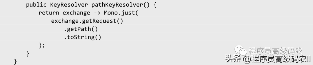 最后,完成对Path的KeyResolver(可以通过KeyResolver来指定限流的Key),实现对特定Path下的限流控制配置。在过滤器中可以配置一个可选的KeyResolver,KeyResolver在配置中根据名称使用SpEL引用Bean。#{@myKeyResolver}是引用名为“pathKeyResolver”的Bean的SpEL表达式。KeyResolver接口允许使用可插拔策略来派生限制请求的Key。代码如下: