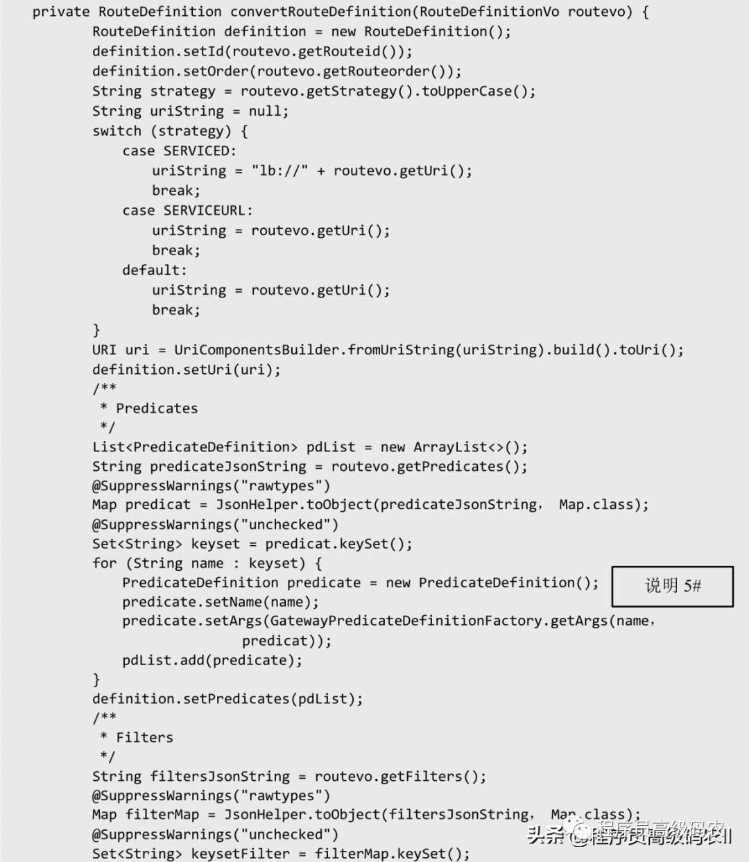 说明1#:在代码段中,refreshRoute方法是事件监听的入口方法,该方法会向Admin管理服务暴露一个REST服务。当Admin对路由进行更改后,会调用refreshRoute方法,触发Spring Cloud Gateway自带的RefreshRoutesEvent事件,同时设置原子布尔变量routedefine为true,在下面的动态路由加载中根据该原子布尔变量决定是从数据库中读取路由还是从缓存中读取路由。