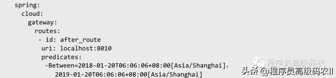 设置时间之间断言:从Between Route Predicate Factory中获取一个UTC时间格式的参数,当请求的当前时间在配置的UTC时间之间,则成功匹配,否则不能成功匹配。下面是实例配置: