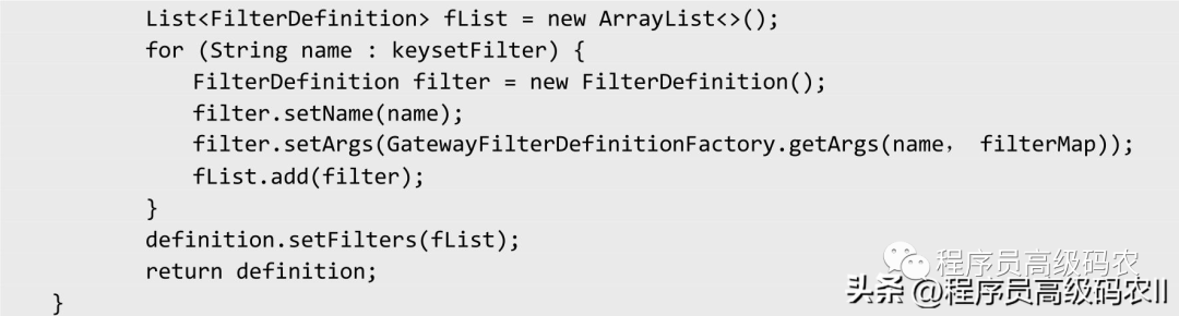 GatewayPredicateDefinitionFactory完成过滤器的模式匹配转换。FilterDefinition是过滤器的模型定义,定义name为Key、args为Value。举例如下: