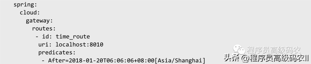 设置时间后断言:从After Route Predicate Factory中获取一个UTC时间格式的参数,当请求的当前时间在配置的UTC时间之后,则成功匹配,否则不能成功匹配。下面是实例配置: