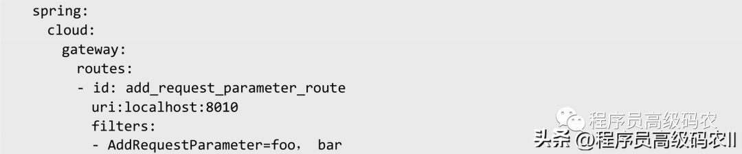 AddRequestParameter GatewayFilter Factory采用一对名称和值作为参数,配置参数application.yml如下: