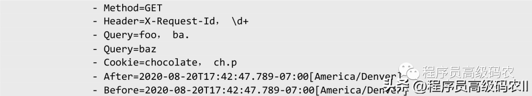 在上述配置文件中,如果多种Predicates同时存在于同一个路由,请求必须同时满足所有条件才能被这个路由匹配。当一个请求满足多个路由的Predicate条件时,请求只会被首个成功匹配的路由转发。下面分别对不同规则的路由匹配进行解释。