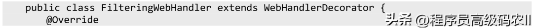 DispatcherHandler 通 过 SimpleHandlerAdapter 组 件 调 用FilteringWebHandler模块的handler方法,FilteringWebHandler模块接着调用之前在容器中注册的所有 Filter,处理完毕后返回Response,代码如下: