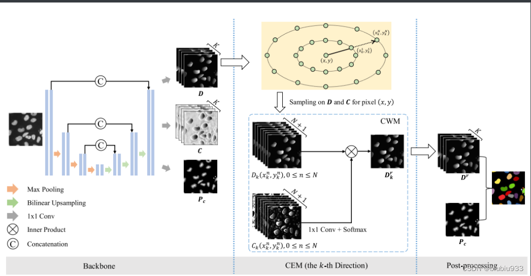 分三步走,先对输入的图像利用以U-net为backbone的网络进行特征提取和输出,第二步利用本文提出的CEM来对特征进行处理,第三步进行后处理得到分割实例