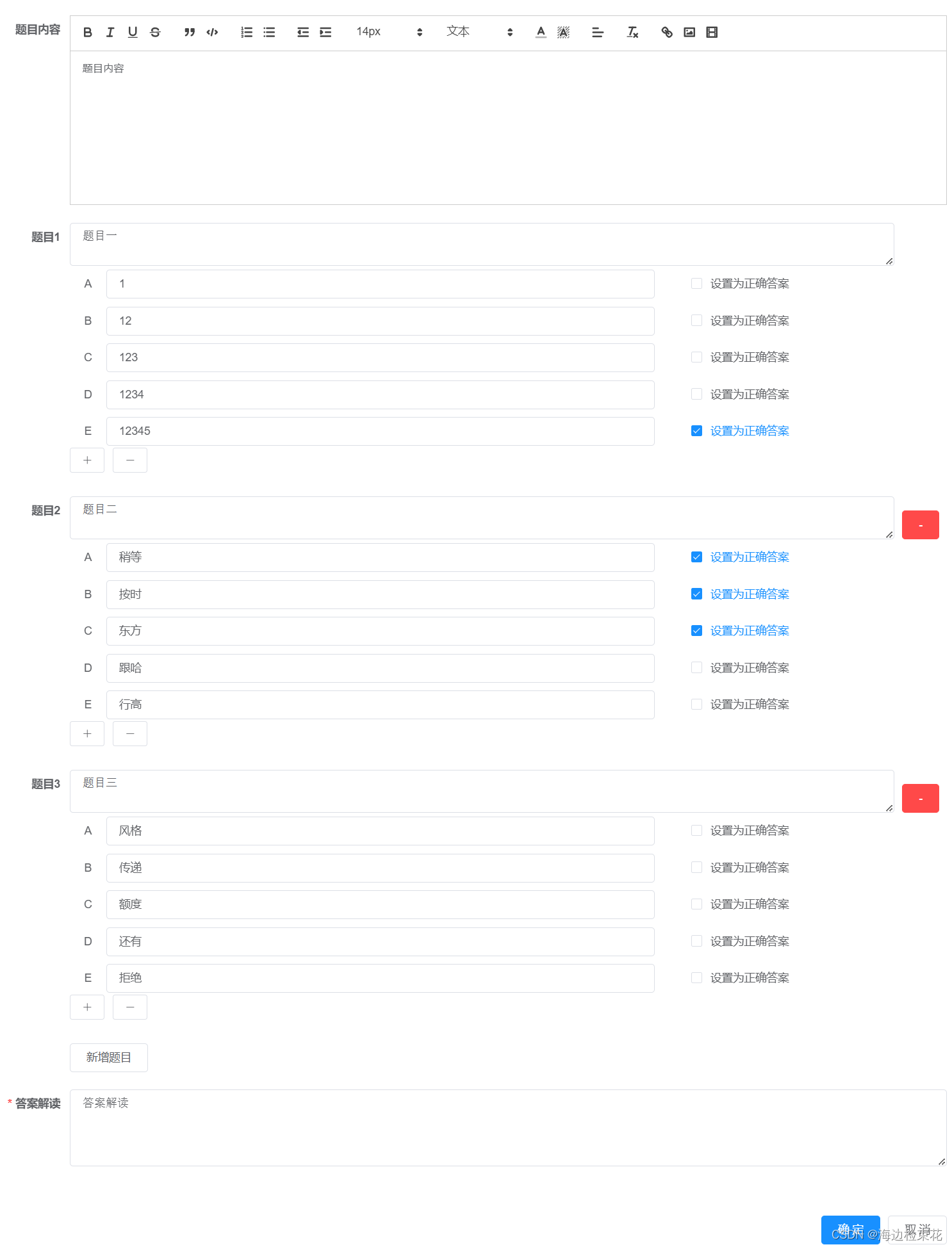 新增和修改的时候因为有多个题目(题目的个数是不固定的)所以前端传递一个数组 后端接收一个数组。