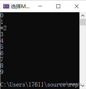 可以看到,第一个输出结果经过了continue就直接跳过了putchar('*')这个式子,而且就跟平常for循环中的continue一样返回到头部i+1再出来;而当i=1时经过了break后,程序就可以走到后面的putchar('*'),并且继续循环。