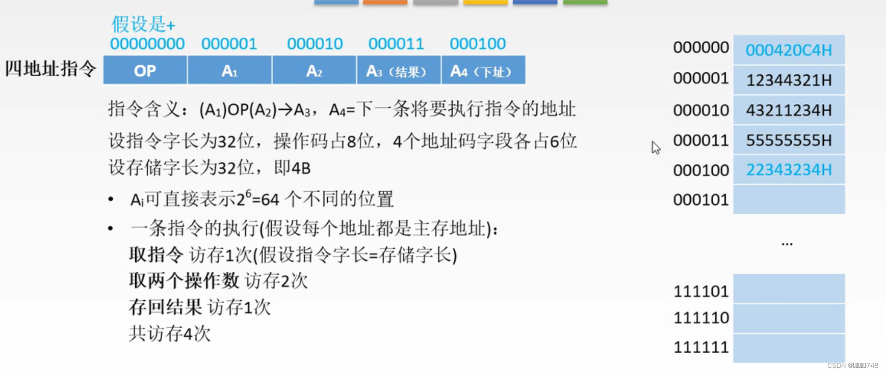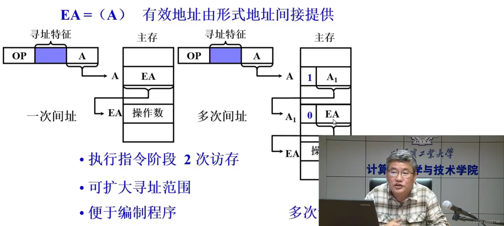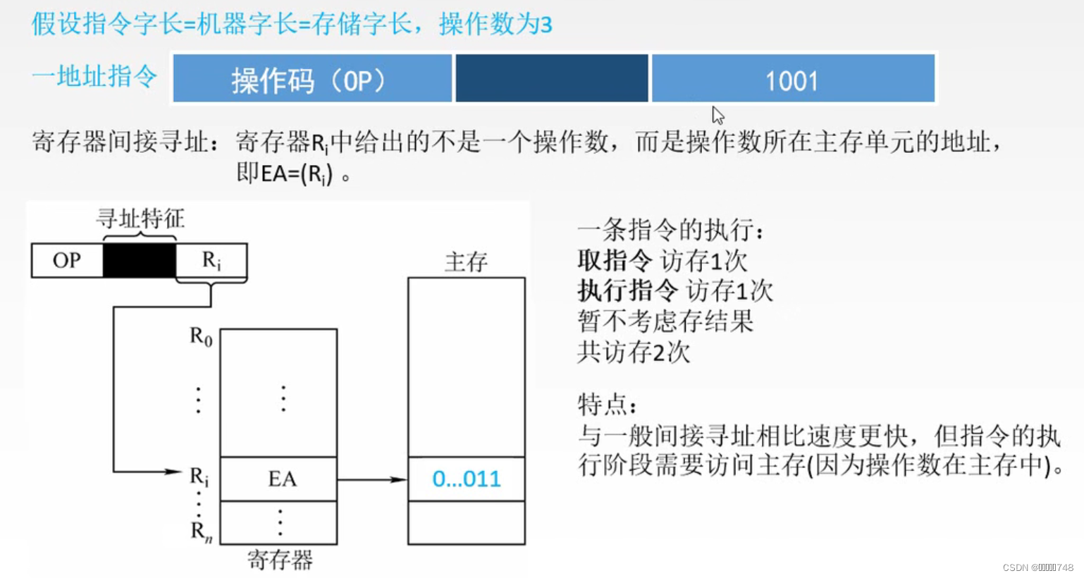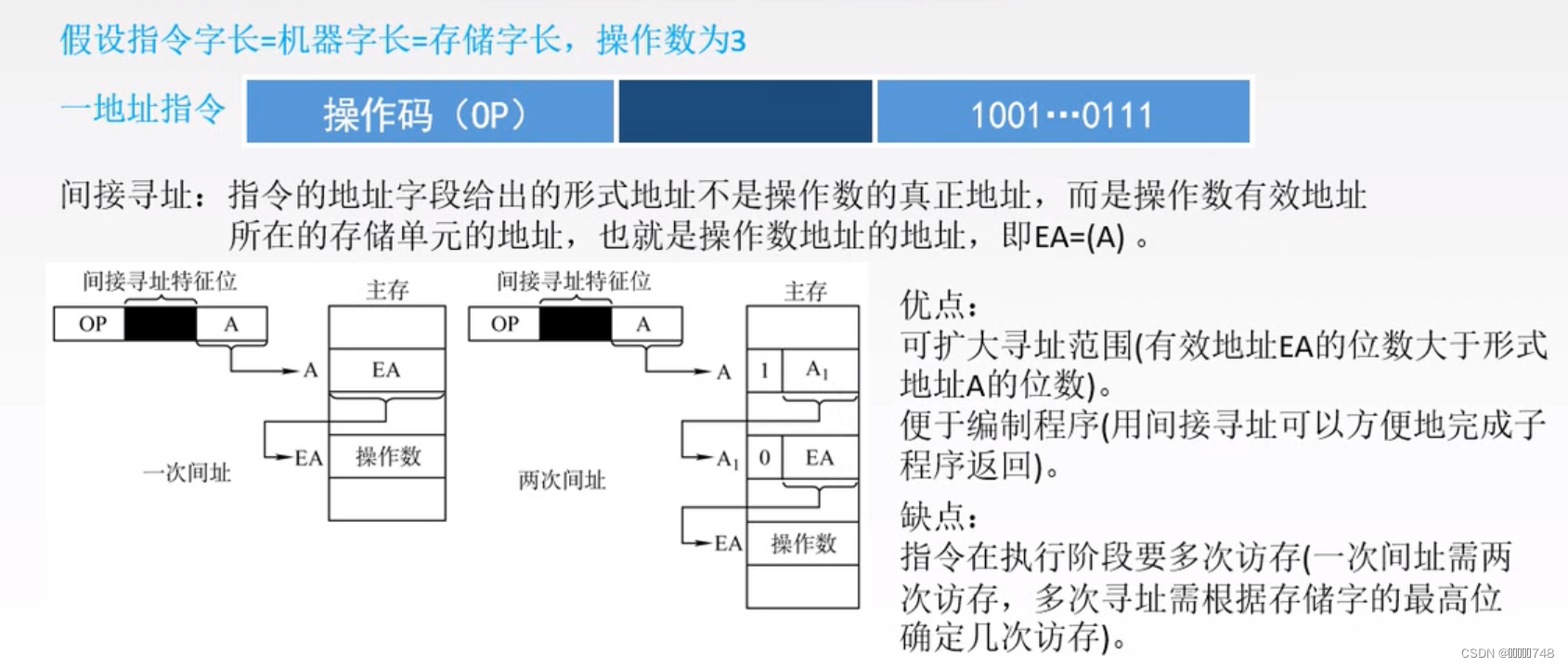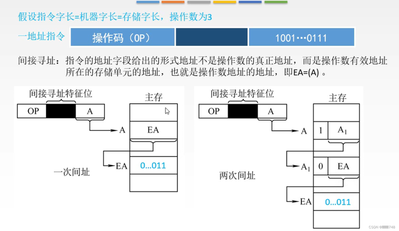 多次间址:主存中标记为1的A说明只是中间地址,标记为0的说明是真正的有效地址EA,最后通过有效地址找到真正的操作数。