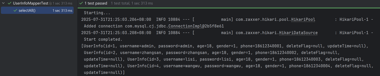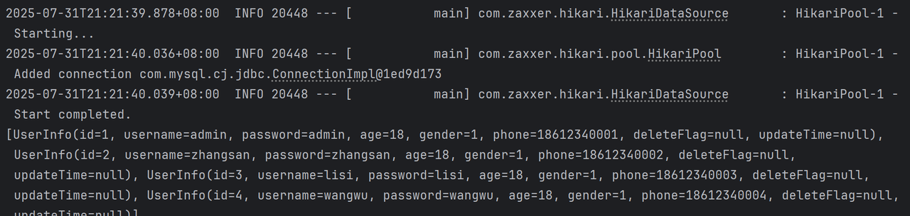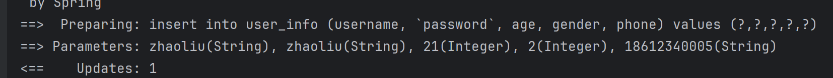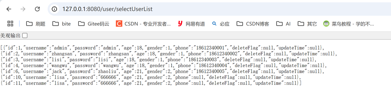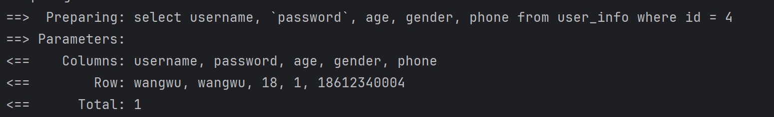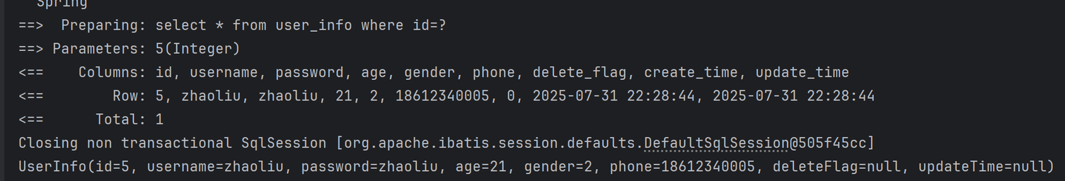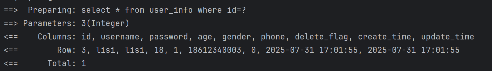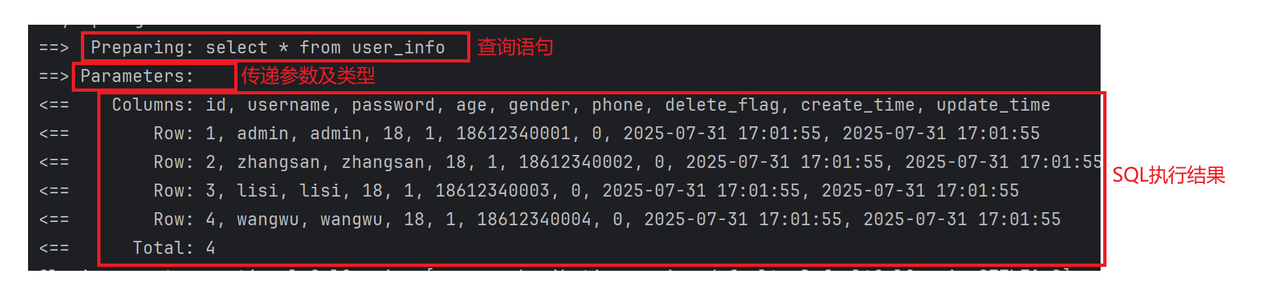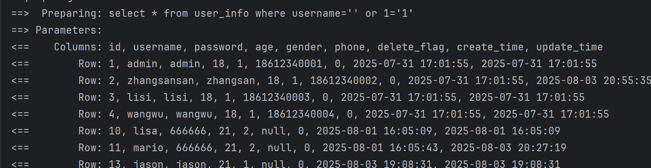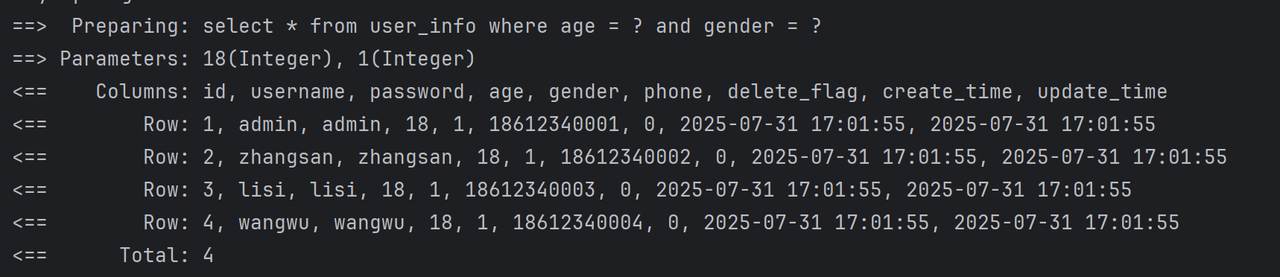 @Select("select id, username, age, gender, phone, delete_flag, create_time, update_time " +