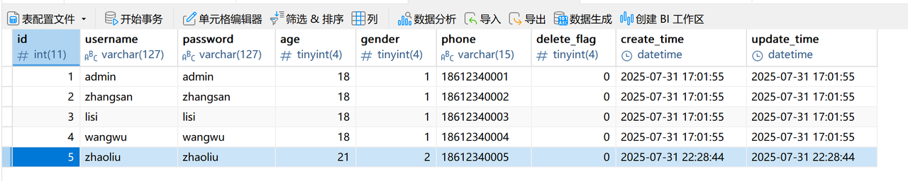 select id, username, age, gender, phone, delete_flag, create_time, update_time