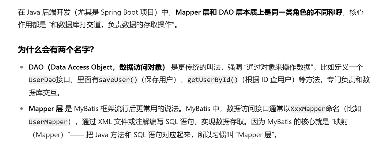 类比:公司的 “业务部”,处理具体业务规则,调用 “仓库”(mapper