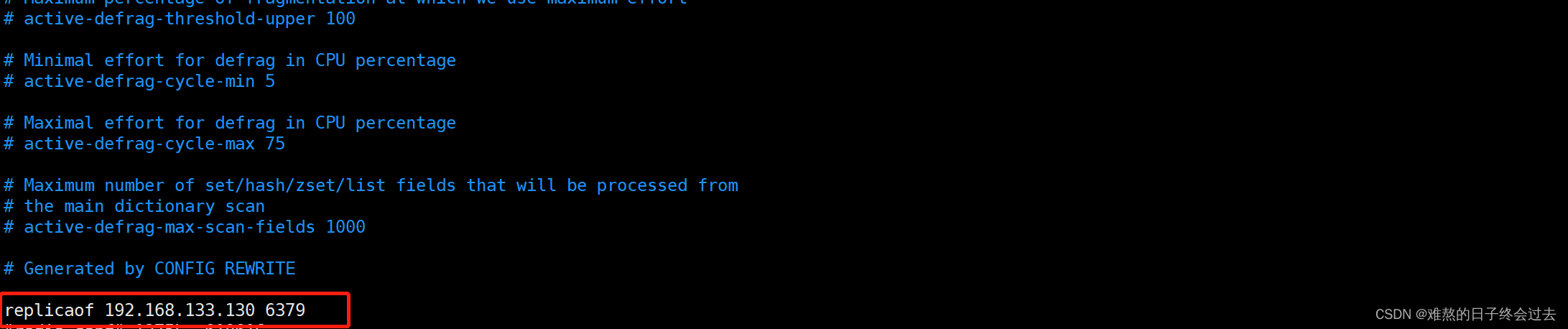 相比主节点,2个从节点的配置文件多了: replicaof 10.211.55.8 6379(因为我用的是5.0版本所以这里使用replicaof,如果是5.0版本以下,则要使用slaveof)