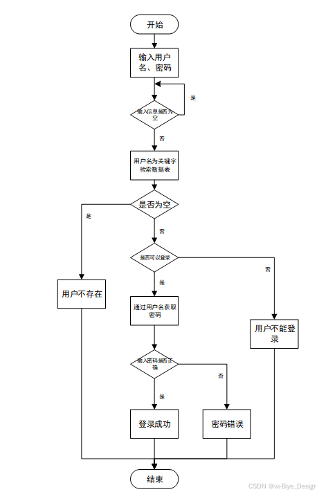 用户输入用户名和密码后,系统先检查输入是否为空,再验证用户名是否存在,若存在则通过用户名获取密码并校验。若密码正确则登录成功,否则提示密码错误。若用户名不存在或无法登录,提示用户操作无效。如图3-4所示。