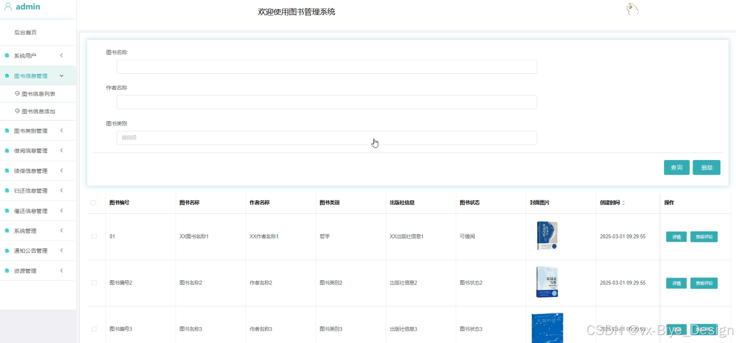 - 借阅信息管理:借阅信息管理功能使管理员能够跟踪和管理用户的借阅活动。管理员可以删除或查询借阅记录,查看借阅详情,审核借阅状态,处理归还、续借和催还事宜。这一功能确保了借阅流程的顺畅和图书资源的有效管理。