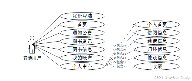 - 个人中心:个人中心是用户管理个人信息和借阅记录的集中地,包括个人首页、借阅信息、续借信息、归还信息、催还信息和收藏。用户可以在这里查看自己的借阅历史、进行图书续借、了解即将到期或已逾期的图书,并管理自己的收藏列表。