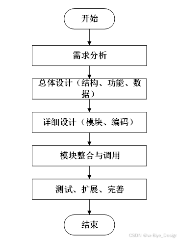 系统开发流程的主要步骤,从需求分析到系统完成的全过程。流程包括需求分析、总体设计(结构、功能、数据)、详细设计(模块、编码)、模块整合与调用,以及测试、扩展和完善,最终完成系统的开发。本系统的开发流程如图3-3所示