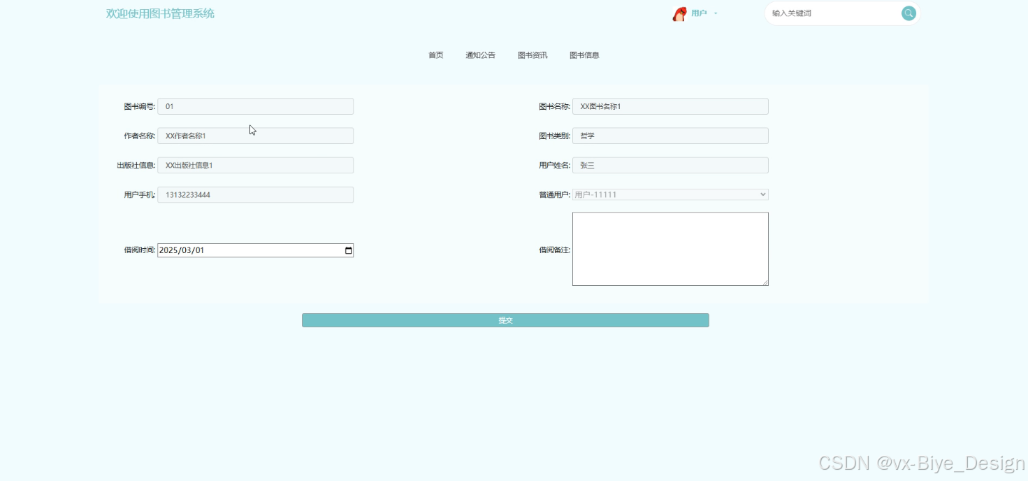 - 首页:首页是用户进入系统后看到的第一个页面,提供快速入口和导航,展示最新或最热门的图书资讯、通知公告等,方便用户快速了解系统动态和获取所需信息。