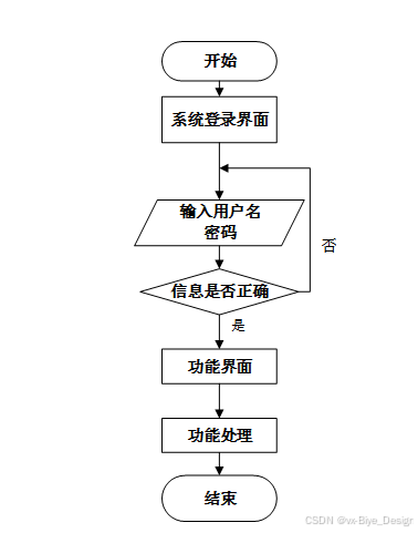用户首先进入系统登录界面,输入用户名和密码后,系统验证信息是否正确。若验证失败,返回登录界面重新输入;若验证成功,则进入功能界面,执行相应功能处理后结束操作流程。操作流程如图3-5所示。