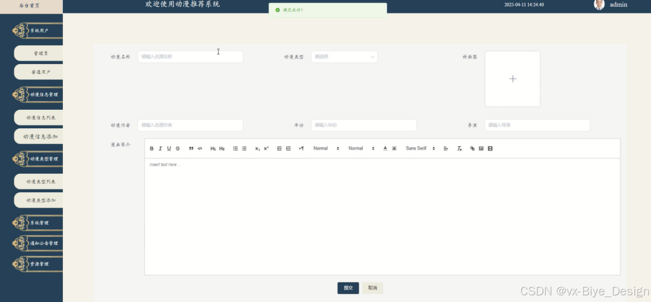 管理员负责管理动漫类型的分类,如添加新的类型标签或编辑已有标签,确保动漫内容能够准确分类。界面如图所示。