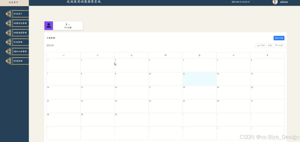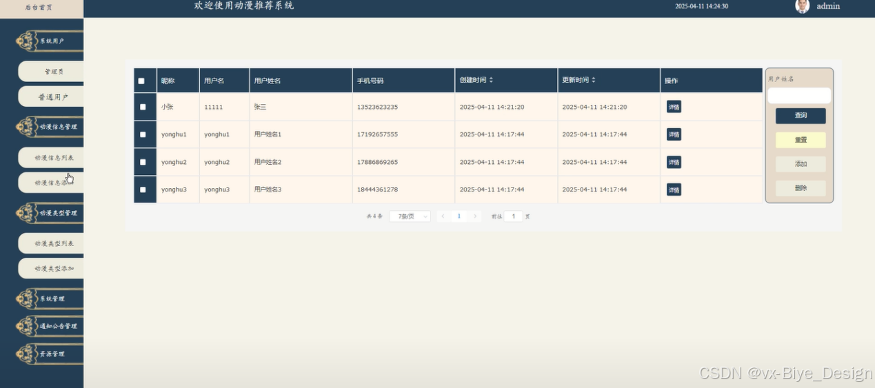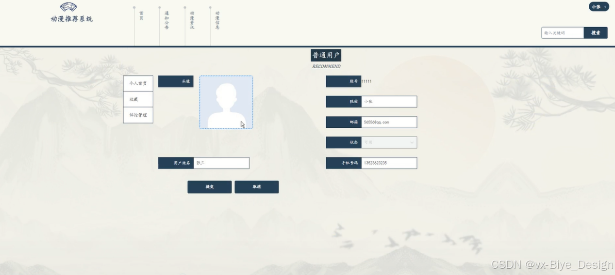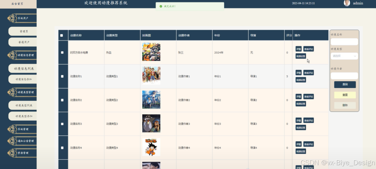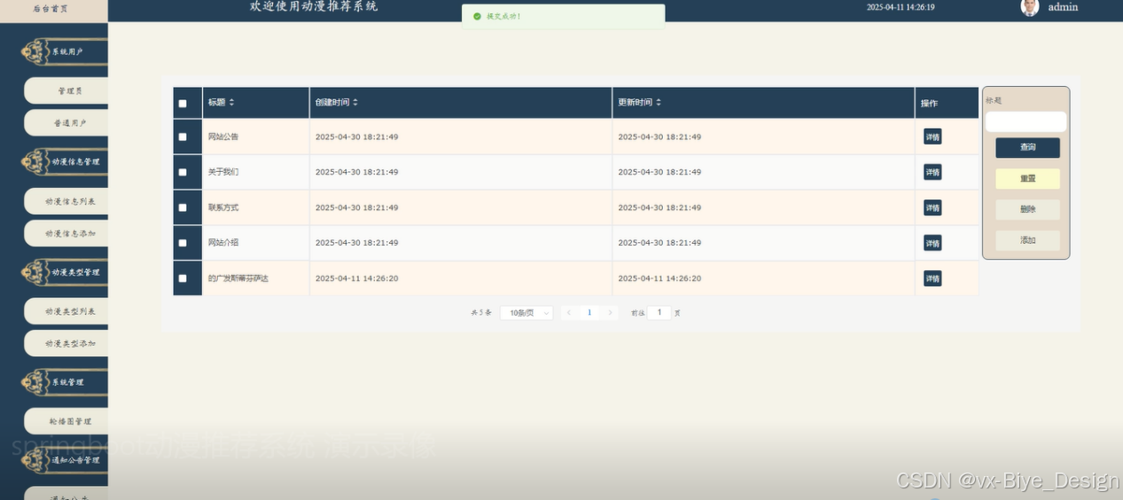 通过该系统,普通用户能够根据自己的兴趣和行为历史获取精准的动漫推荐内容,提升了用户的观看体验;管理员则可以通过后台管理系统,便捷地管理平台上的用户信息、动漫内容、分类和资源,确保平台的高效运作。系统的实施不仅优化了信息流通效率,改善了用户的内容消费方式,还有效解决了传统推荐方式中个性化不足的问题。