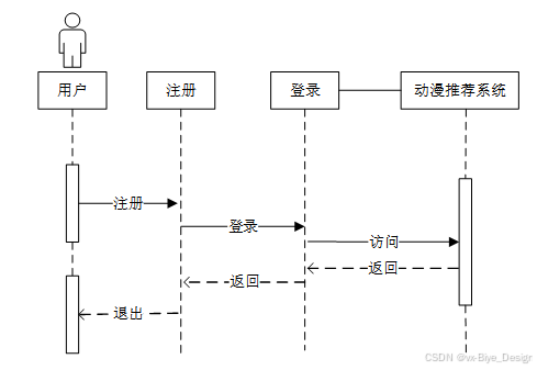 用户通过注册模块发送注册请求,系统完成注册后返回确认信息。随后,用户通过登录模块发送登录请求,系统验证用户信息后允许访问目标系统。用户完成操作后可选择退出,系统终止会话。注册时序图,如图4-3所示。
