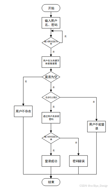 用户输入用户名和密码后,系统先检查输入是否为空,再验证用户名是否存在,若存在则通过用户名获取密码并校验。若密码正确则登录成功,否则提示密码错误。若用户名不存在或无法登录,提示用户操作无效。如图3-4所示。