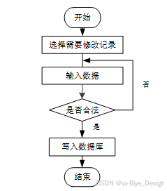 用户首先选择需要修改的记录,输入修改后的数据,系统判断输入数据是否合法。若数据不合法,提示重新输入;若数据合法,则将修改后的数据写入数据库,完成操作后流程结束。修改信息流程图如图3-7所示。