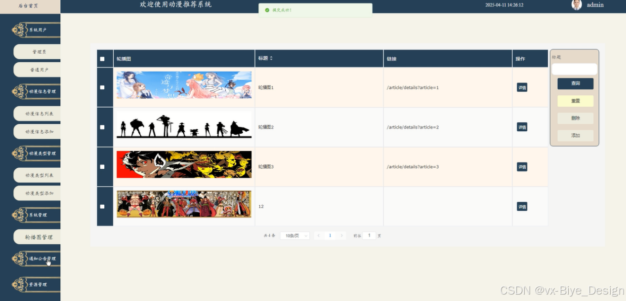 管理员可以管理首页的轮播图,更新重要广告和推荐内容,确保用户在访问时看到最新的宣传信息。界面如图所示。