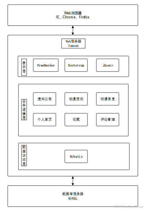 系统由表现层、业务逻辑层、数据访问层和数据库服务器组成。表现层通过浏览器(如IE、Chrome、Firefox)与用户交互,采用FreeMarker、Bootstrap、jQuery等技术实现界面呈现。业务逻辑层负责处理系统的核心业务逻辑,通过分模块设计实现功能分离。数据访问层使用MyBatis框架连接数据库,执行数据的增删改查操作。数据库服务器采用MySQL进行数据存储和管理,为系统提供稳定的数据库支持。整个架构通过Tomcat服务器完成用户请求的接收和处理,确保系统的高效运行[8]。整个系统架构如图4-1所示。