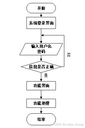 用户首先进入系统登录界面,输入用户名和密码后,系统验证信息是否正确。若验证失败,返回登录界面重新输入;若验证成功,则进入功能界面,执行相应功能处理后结束操作流程。操作流程如图3-5所示。