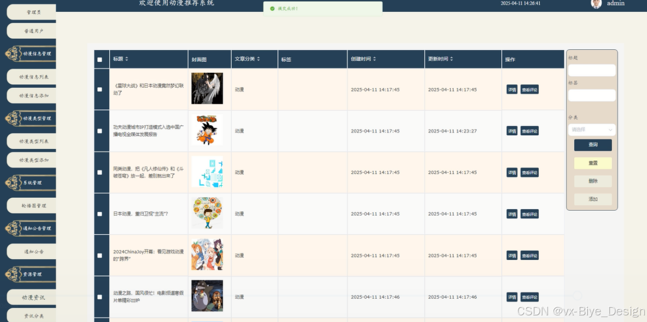 管理员管理动漫资讯的分类和内容,保证资讯更新及时,并根据分类组织展示,便于用户查找感兴趣的新闻。界面如图所示。