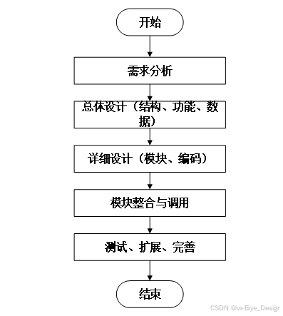 系统开发流程的主要步骤,从需求分析到系统完成的全过程。流程包括需求分析、总体设计(结构、功能、数据)、详细设计(模块、编码)、模块整合与调用,以及测试、扩展和完善,最终完成系统的开发。本系统的开发流程如图3-3所示