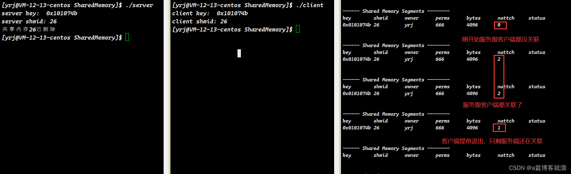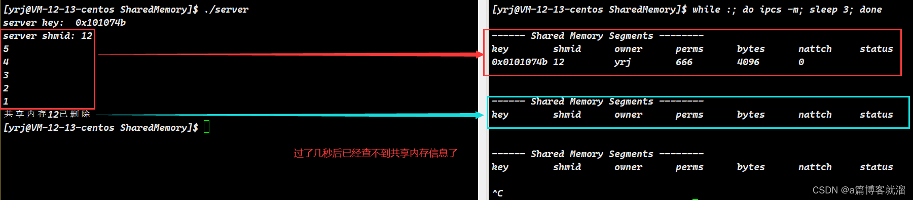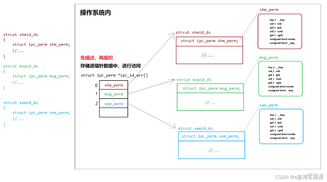 这样一来,操作系统可以只根据一个地址,灵活访问 两个结构体中的内容,比如 struct ipc_perm shm_perm 和 struct shmid_ds,并且操作系统还把多种不同的对象,描述融合入了一个 ipc_id_arr 指针数组中,真正做到了 高效管理。