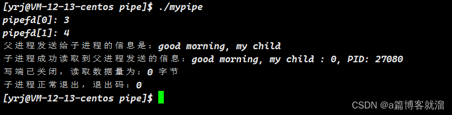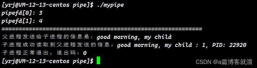 最后一个步骤就是关闭不需要的文件描述符了,如果父进程进行写入,就关闭父进程的读端,关闭子进程的写端。反之则同理。