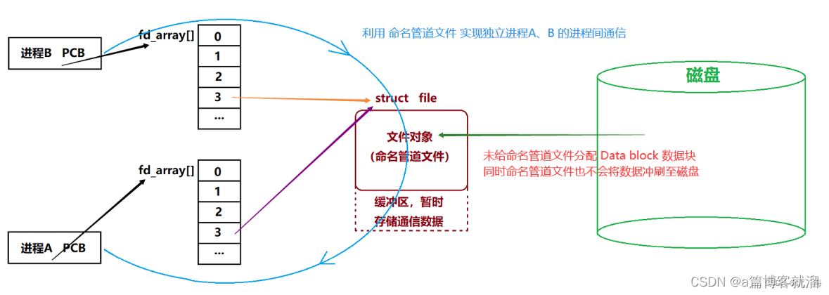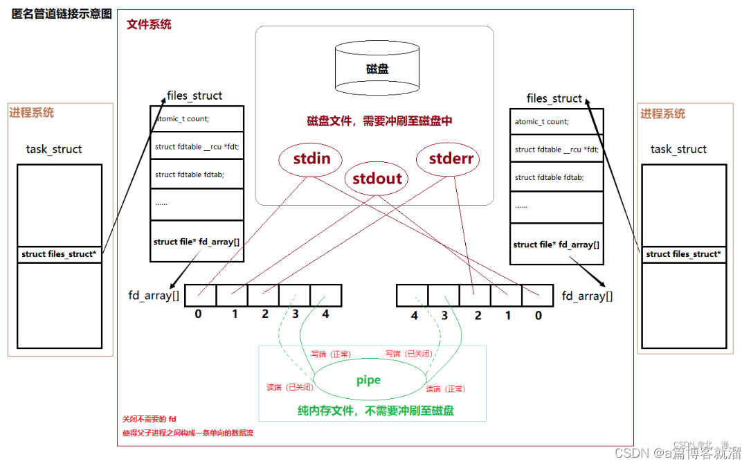 - 创建出的匿名管道文件 pipe虽然属于文件系统,但它是一个特殊文件,一个由 OS 提供的纯纯的内存文件,不需要将数据冲刷至磁盘中,只需要承担进程间通信任务即可。
