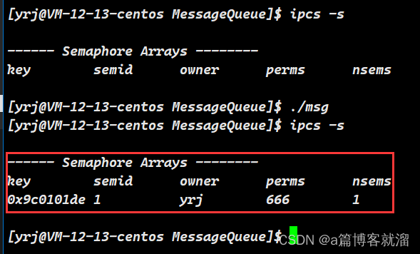 程序运行后,创建了一个 信号量集,nsems 为 1