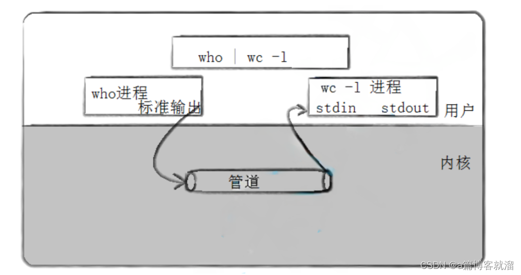例如我们通过 who | wc -l 命令可以看到who进程将数据传递给了 wc -l 进程,两个进程通过管道完成了简单的通信。