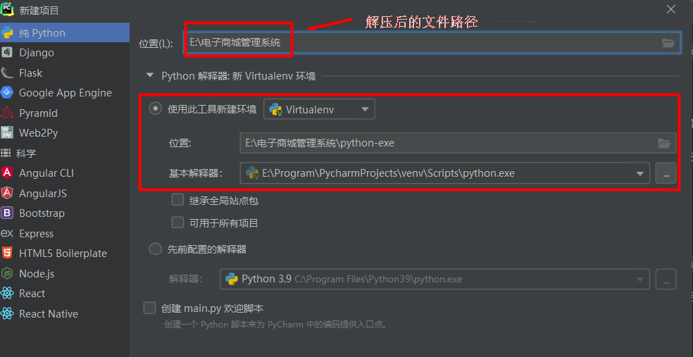 进入pycharm点击文件-新建项目,选择解压后的文件路径作为项目存放路径,创建虚拟环境。